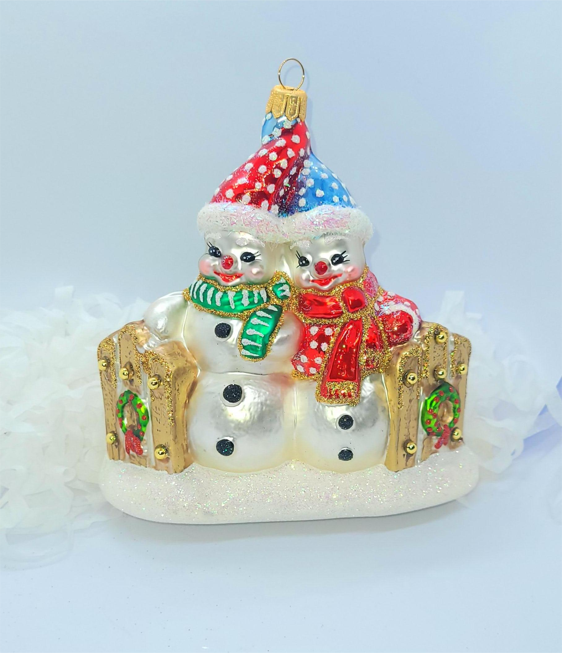 Bombka formowa w kształcie dwóch bałwanków w czapkach i szalikach stojących przy ozdobionym wieńcami płotku.