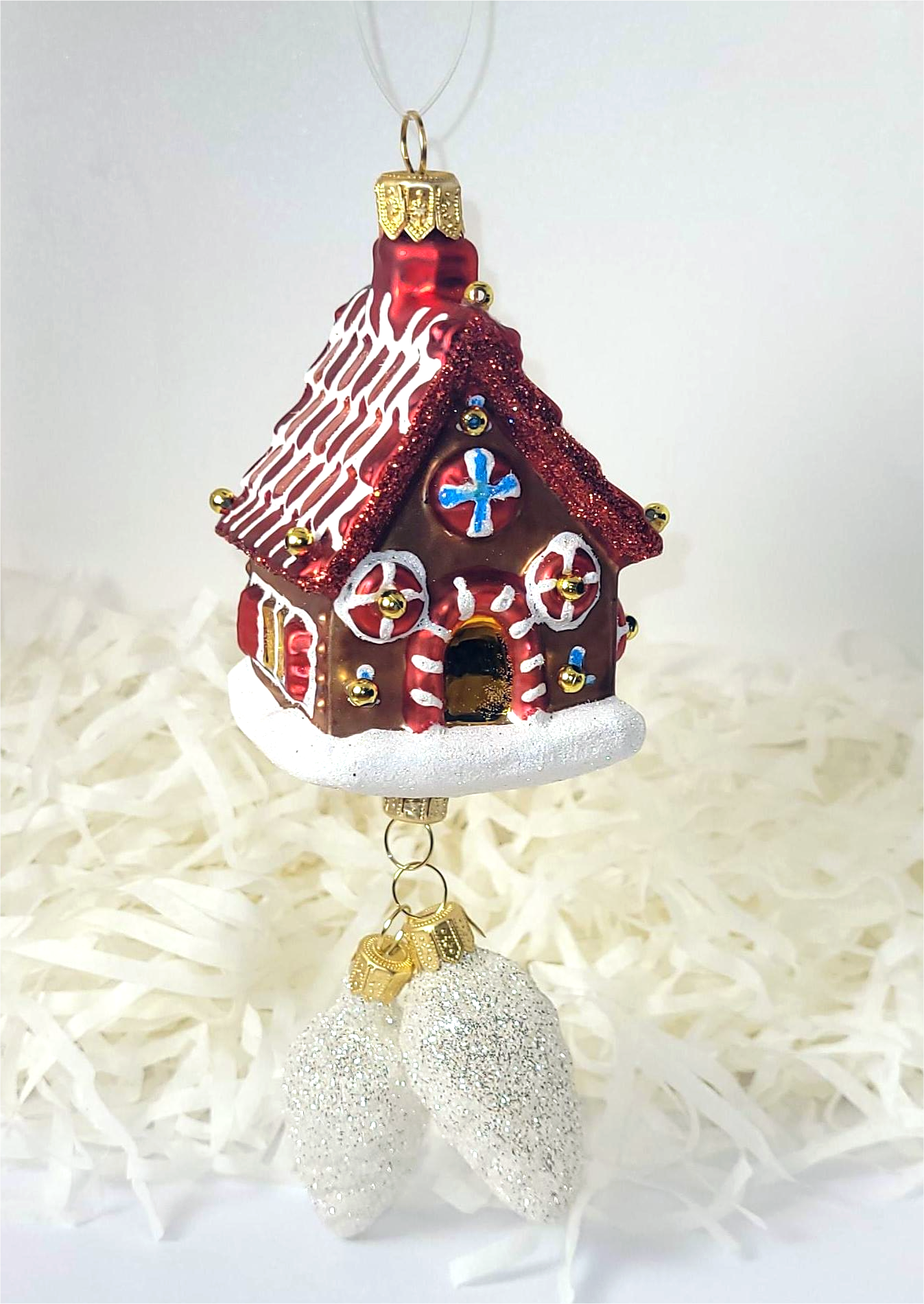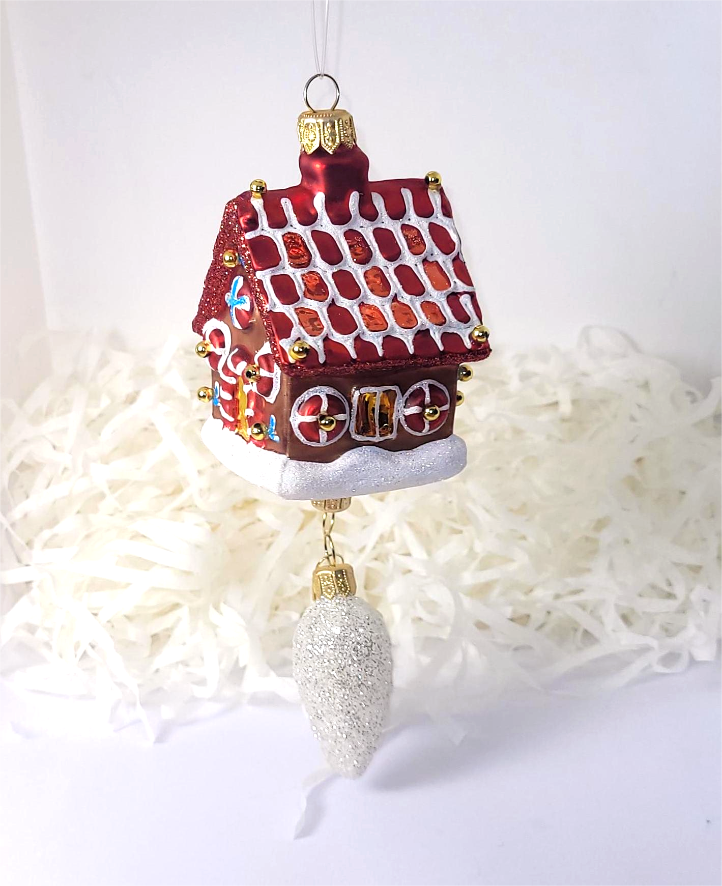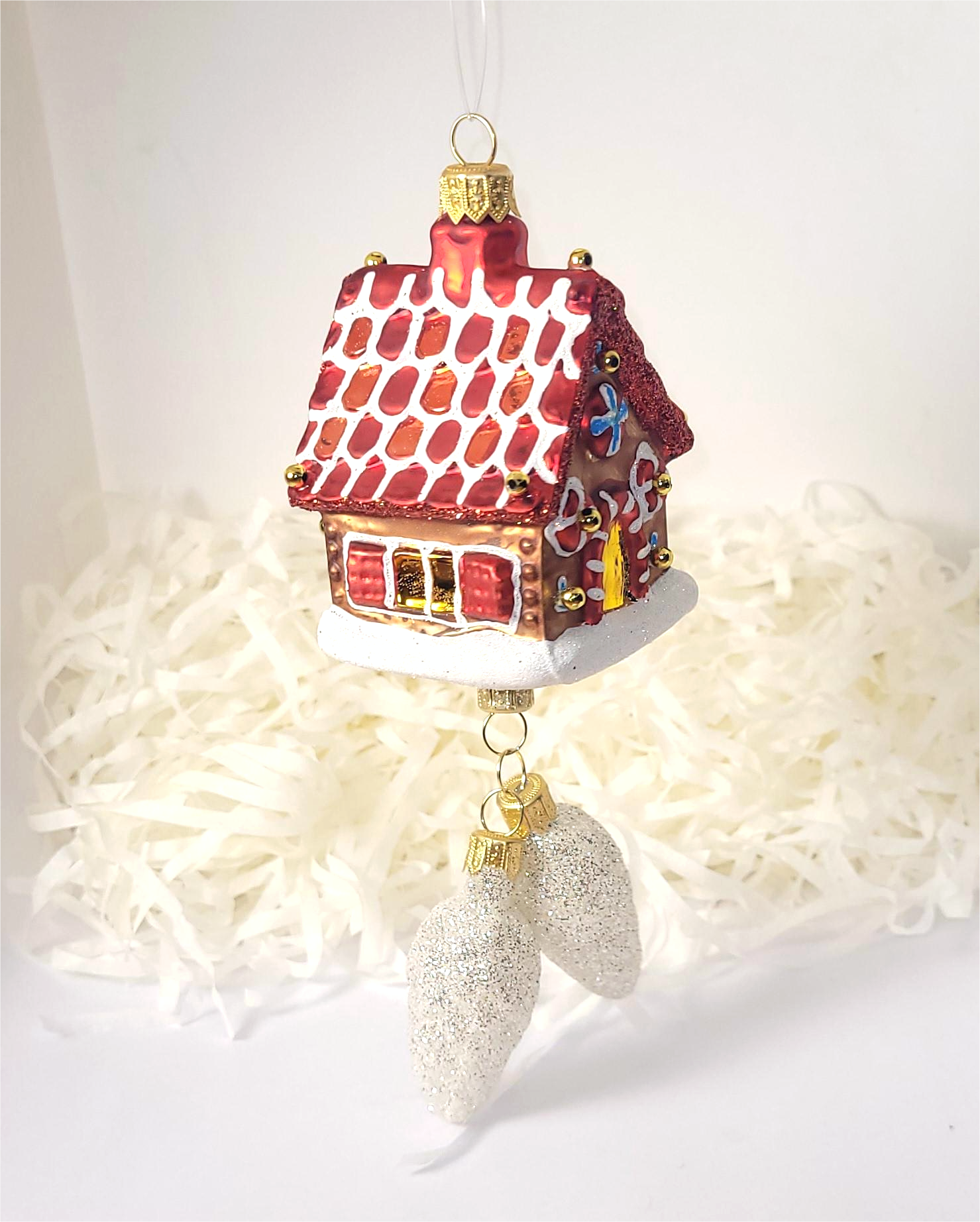 Bombka formowa w kształcie małego piernikowego domku w wielobarwnej stylizacji z podczepionymi od dołu białymi szyszkami.
