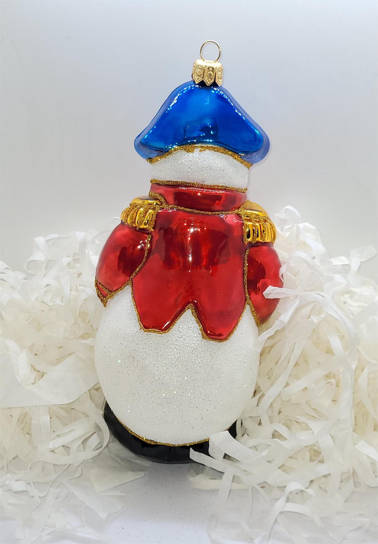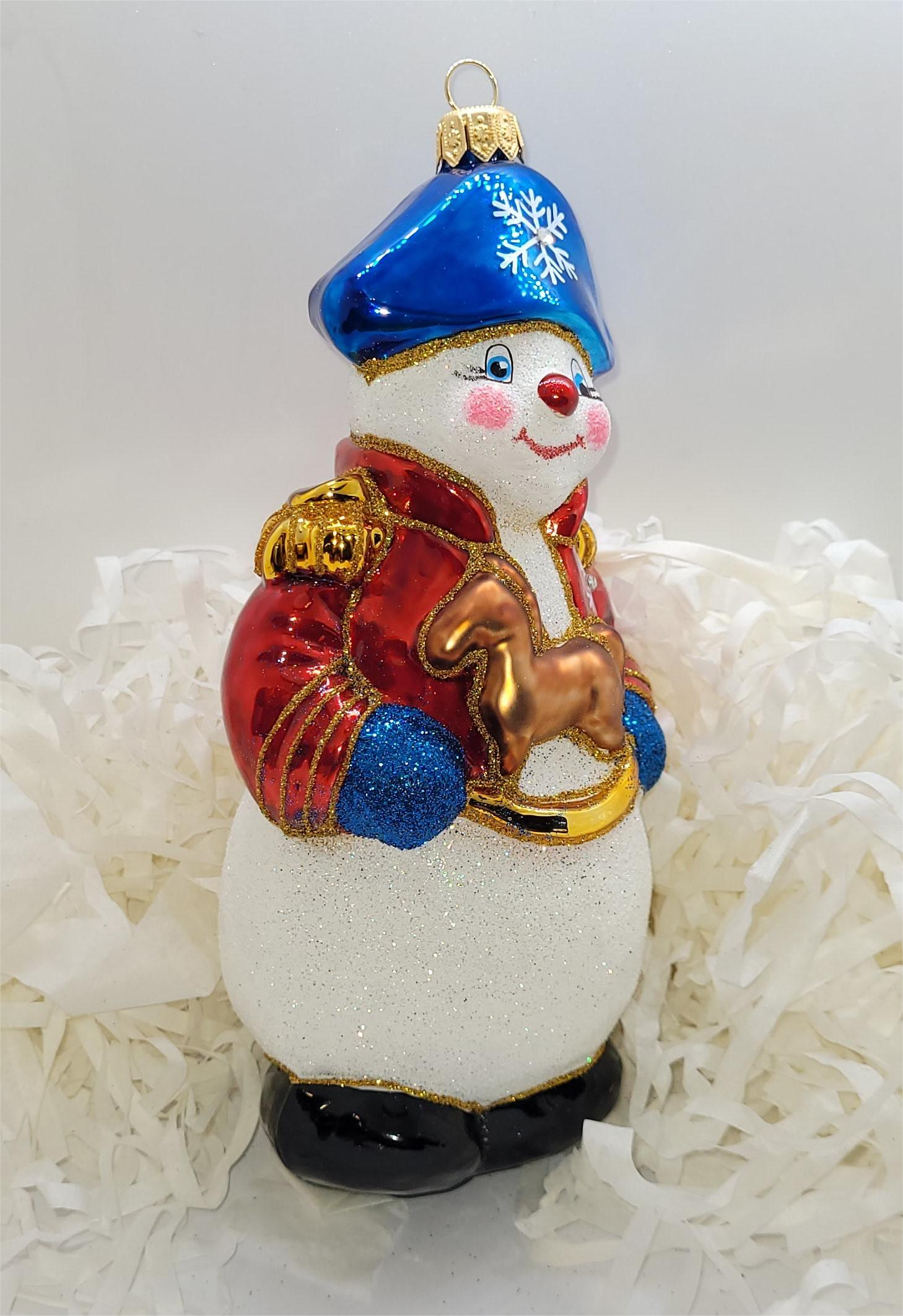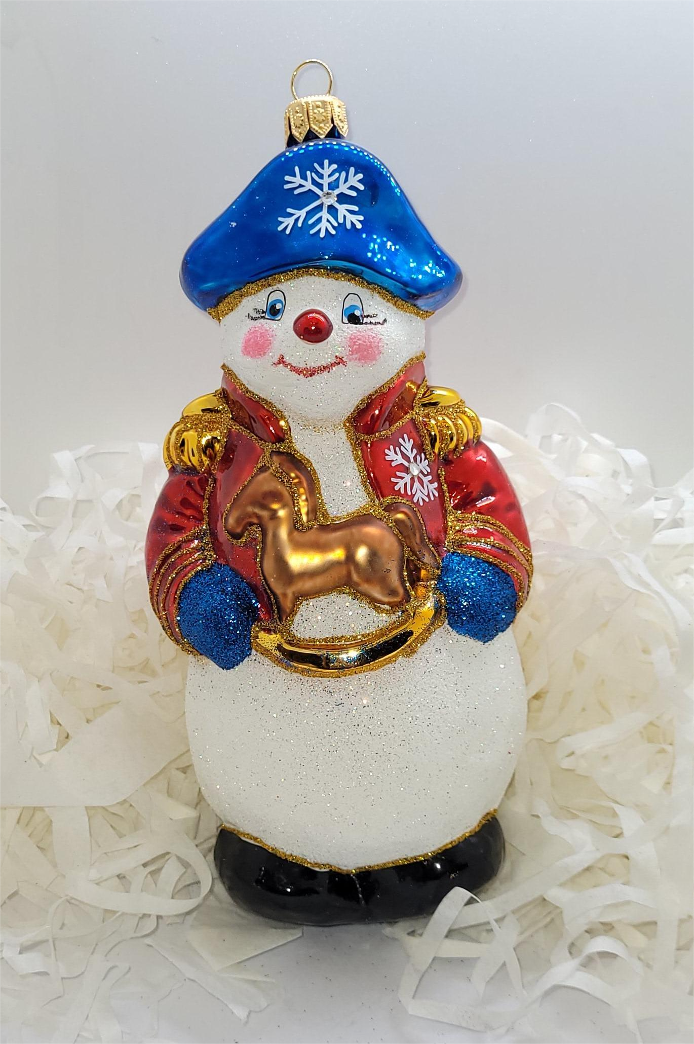 Bombka formowa w w kształcie bałwana w stroju kapitańskim, z małym złotym konikiem w dłoniach.