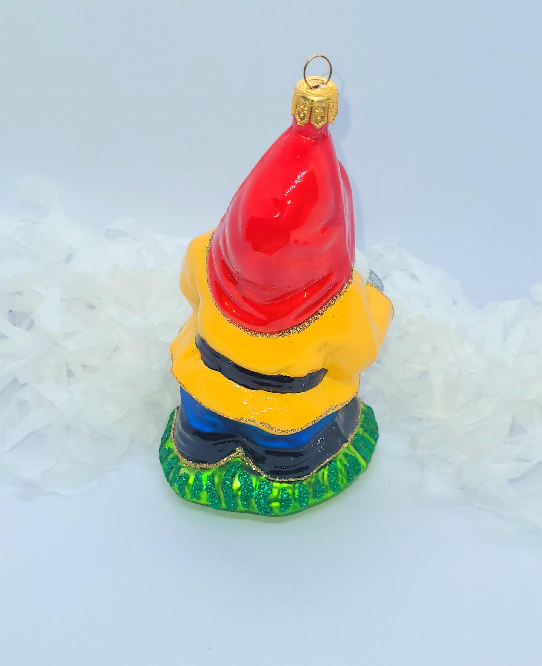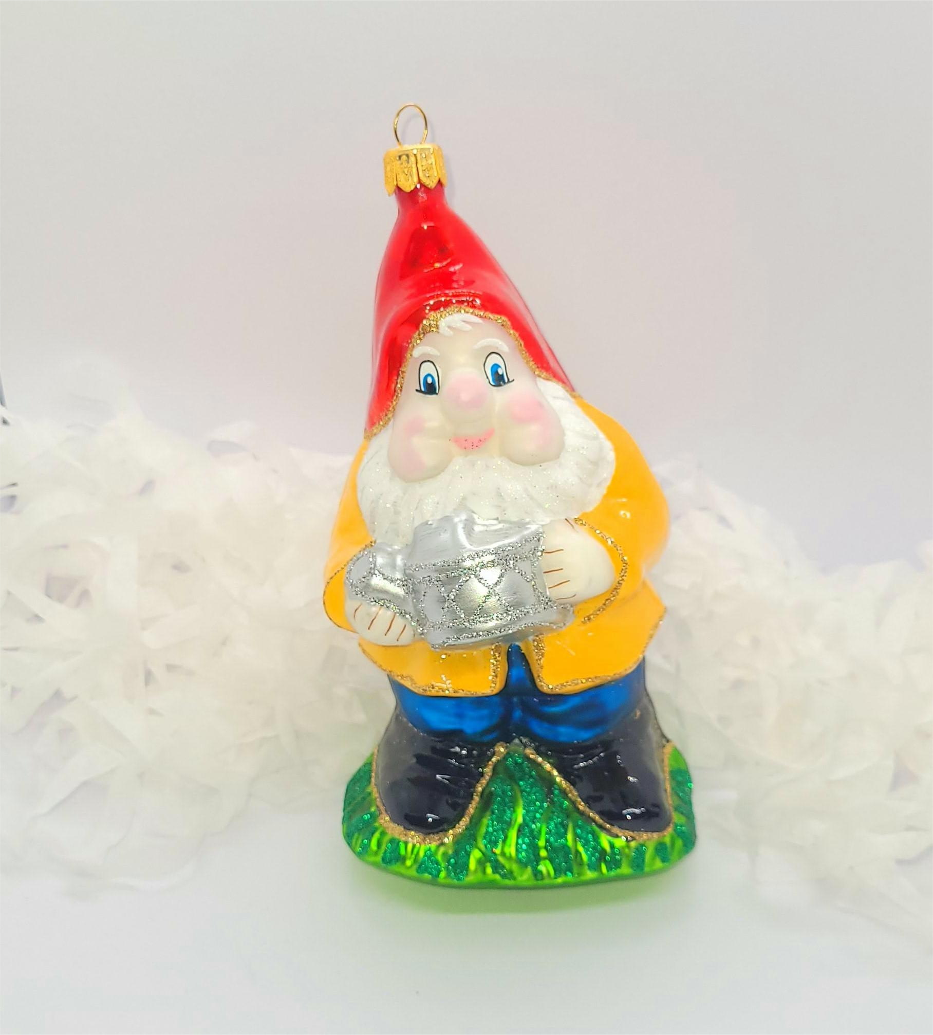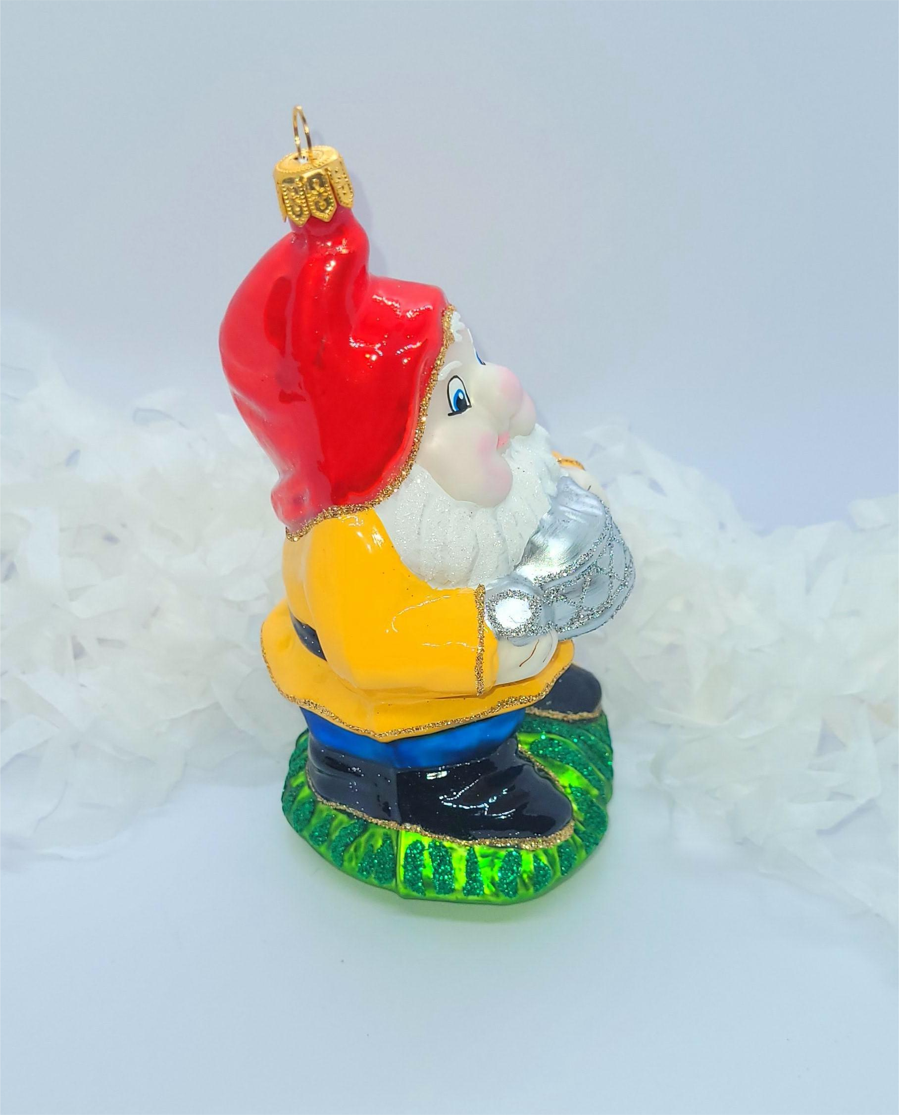 Bombka formowa w kształcie disneyowskiego krasnoludka ściskającego konewkę w rękach.