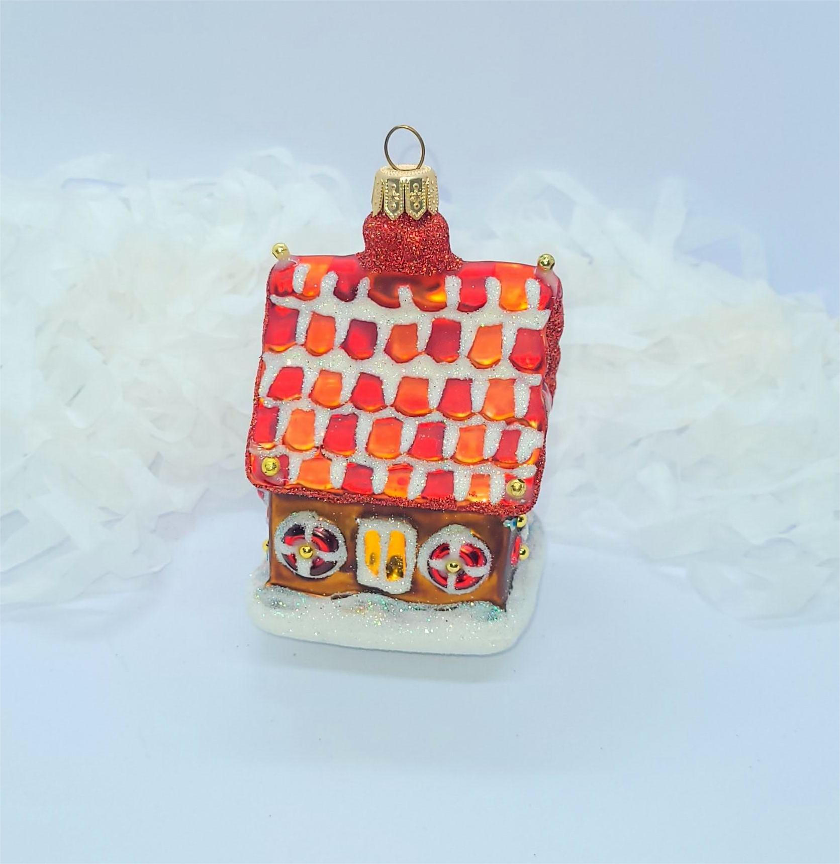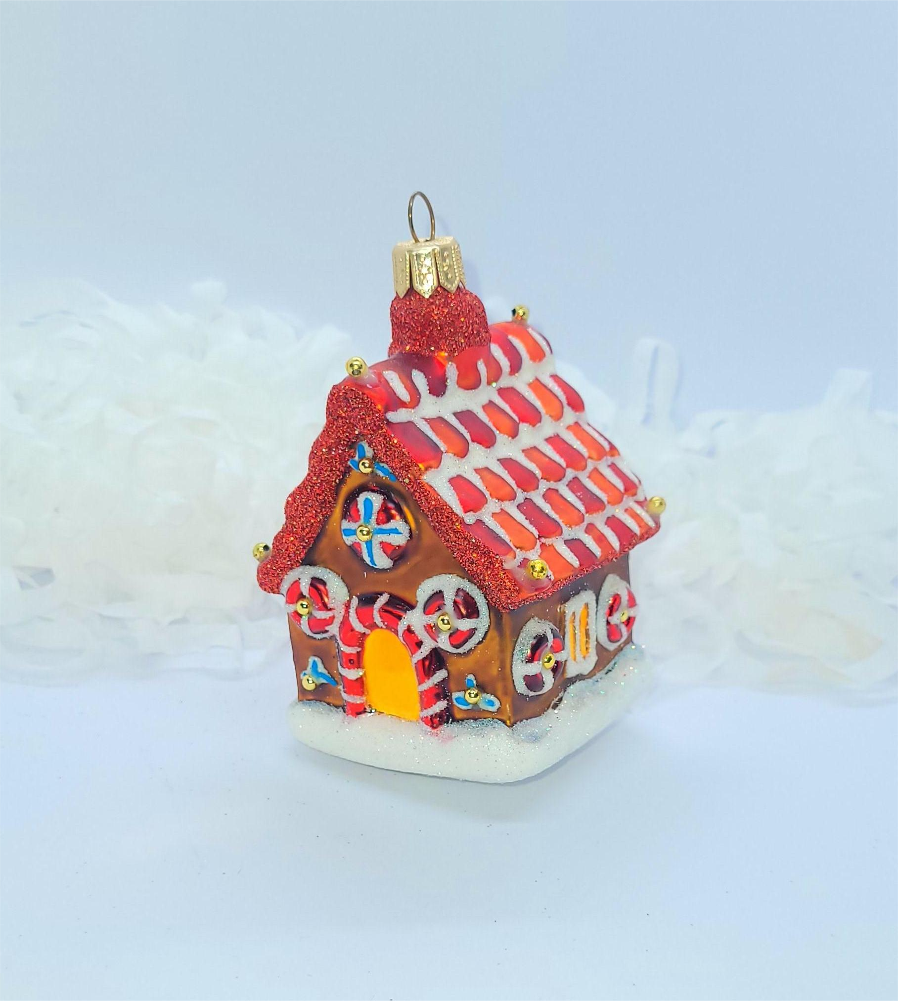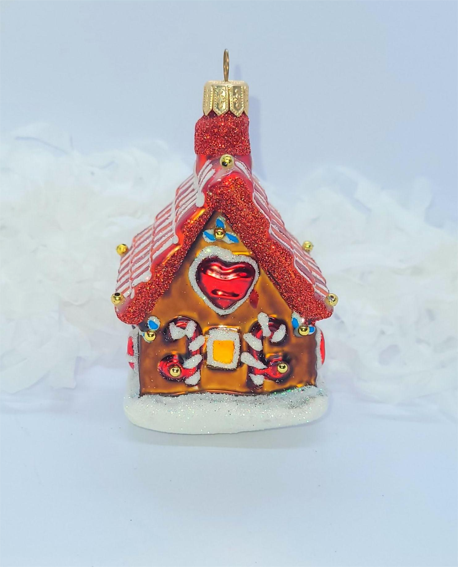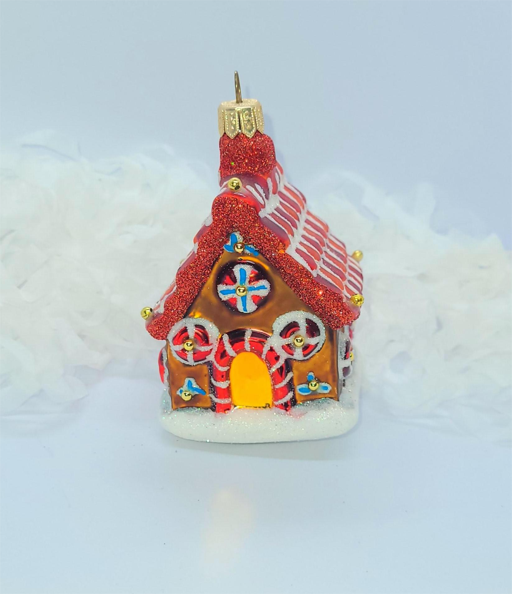 Bombka formowa w kształcie małego piernikowego domku w wielobarwnej stylizacji
