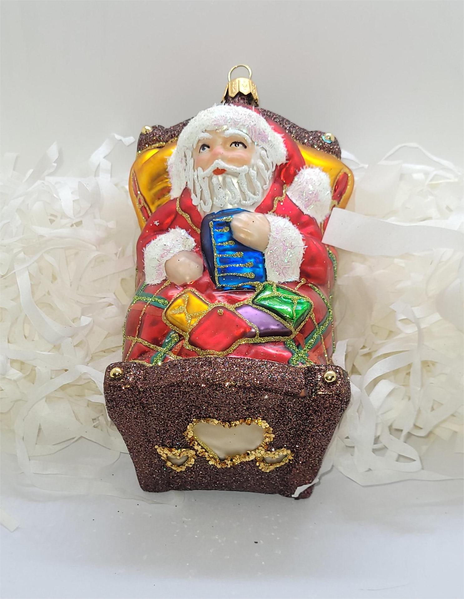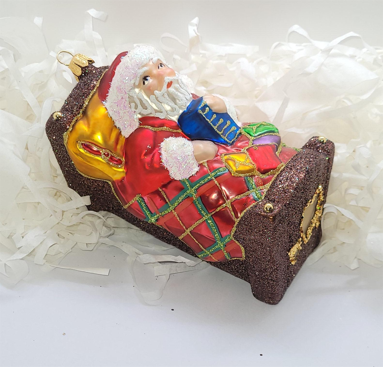 Bombka formowa w kształcie Mikołaja leżącego z prezentami w zdobnym łóżku