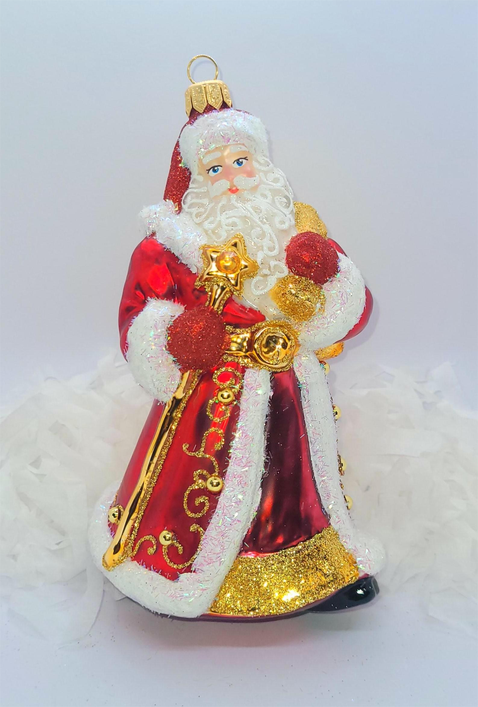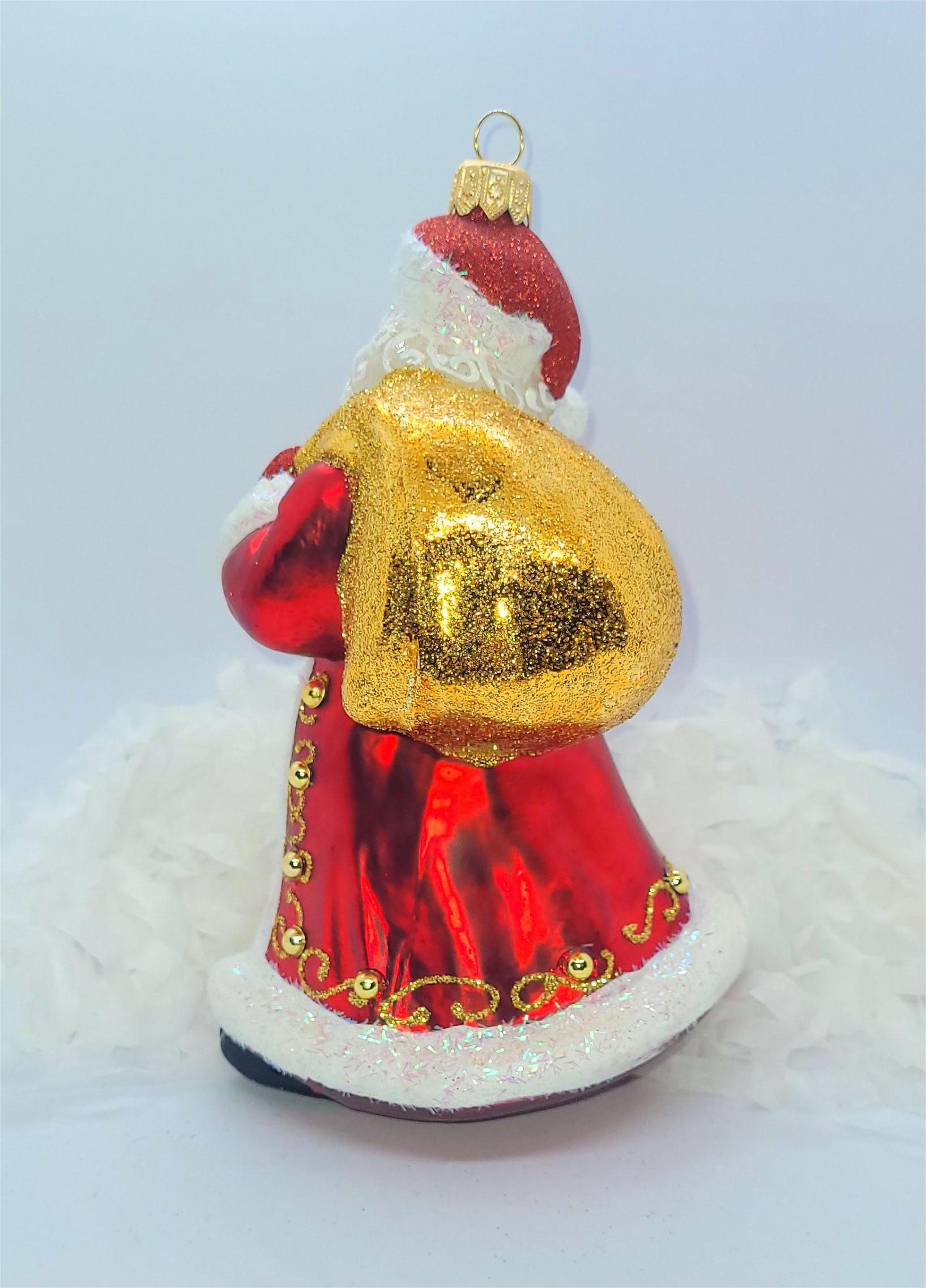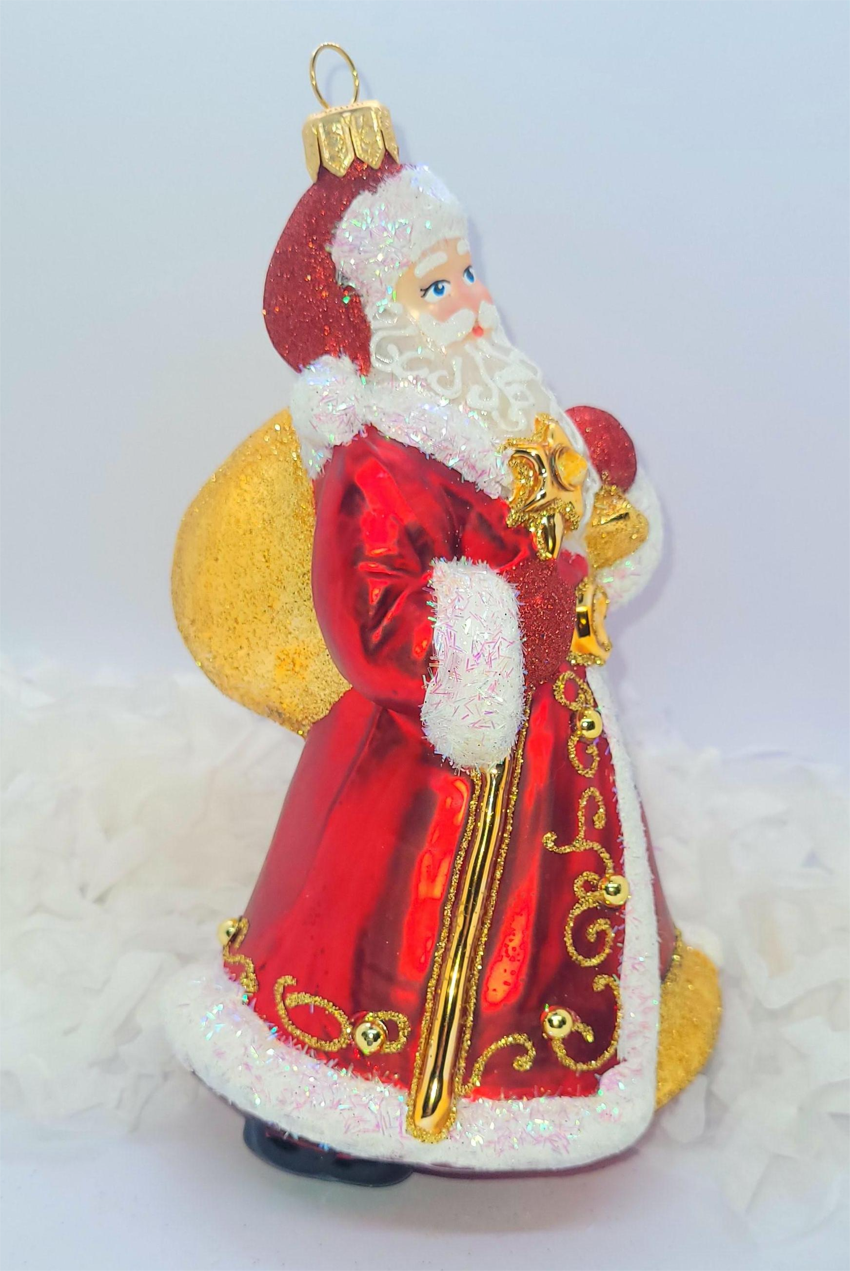 Bombka formowa w kształcie Mikołaja workiem na prezenty oraz gwieździstą laską.
