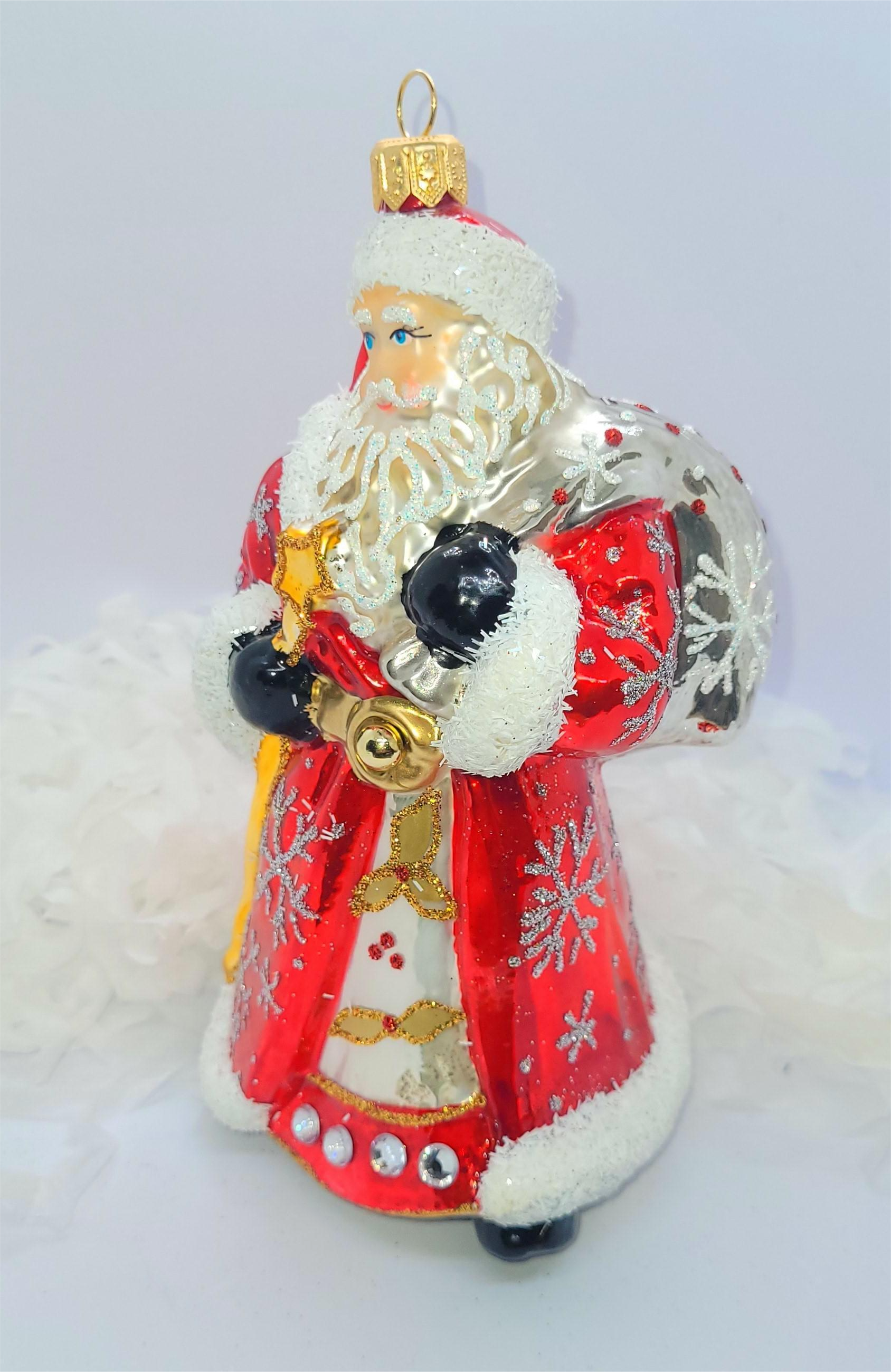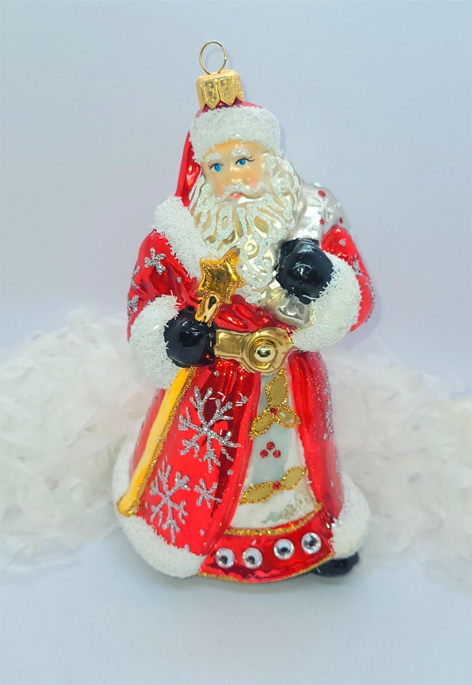 Bombka formowa w kształcie dużego Mikołaja workiem na prezenty oraz gwieździstą laską.