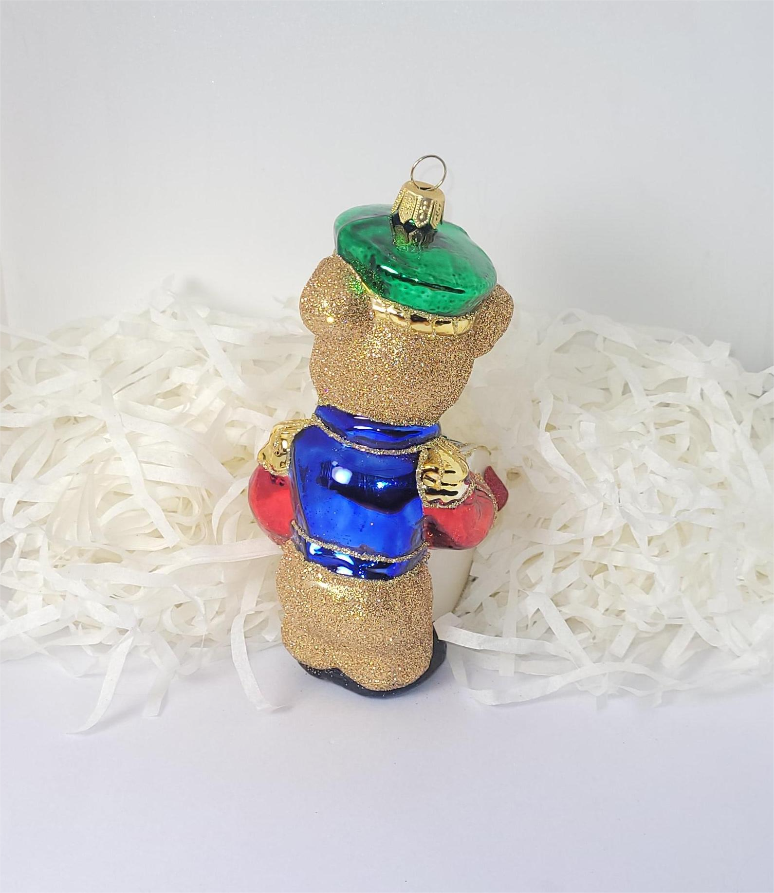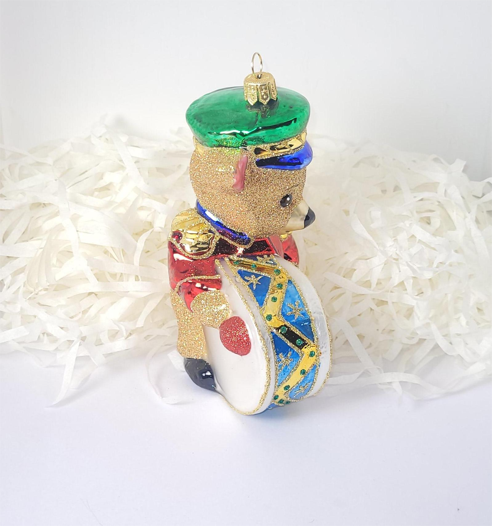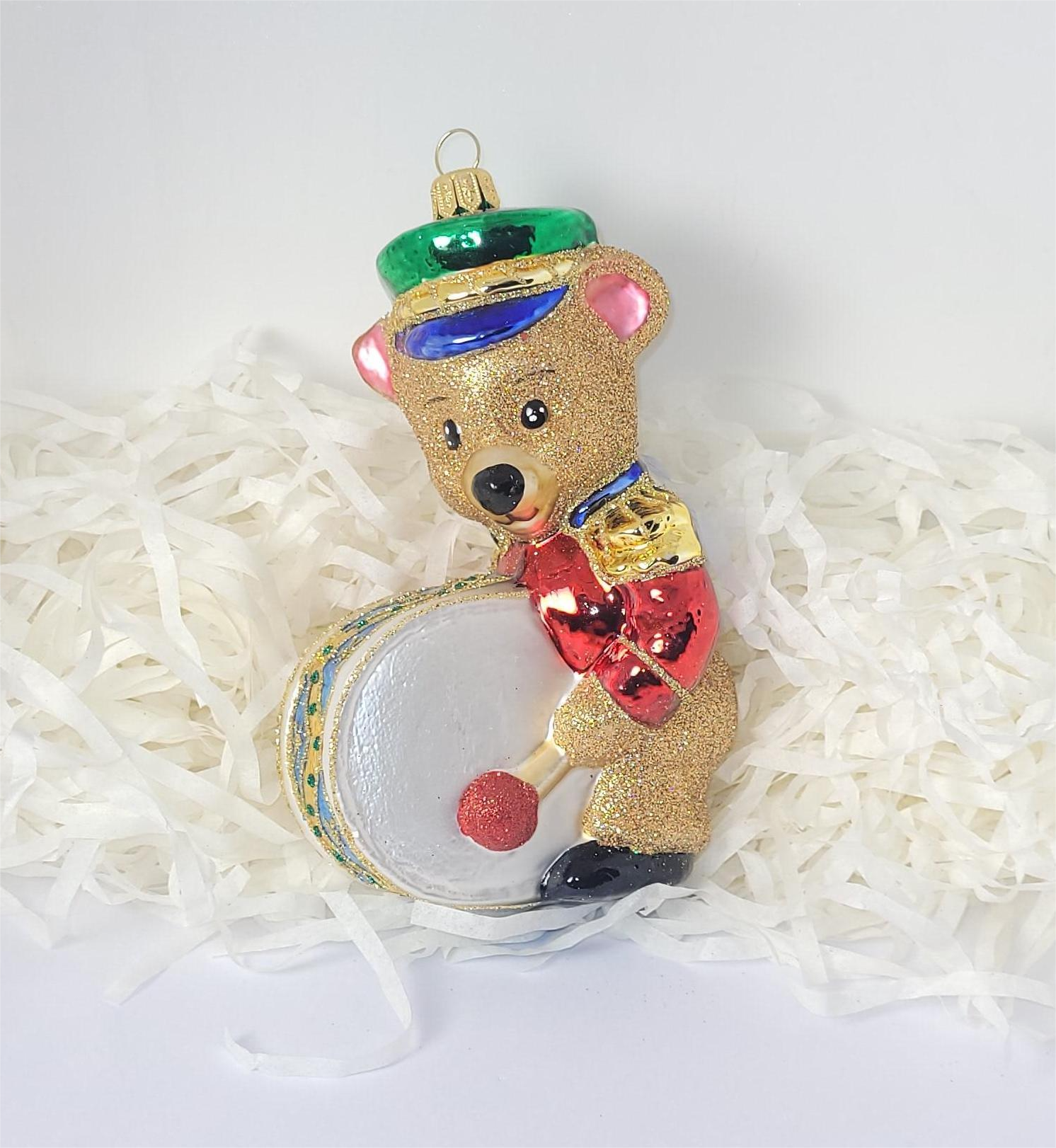 Bombka formowa w kształcie misia w cyrkowym ubranku z bębenkiem i pałeczkami