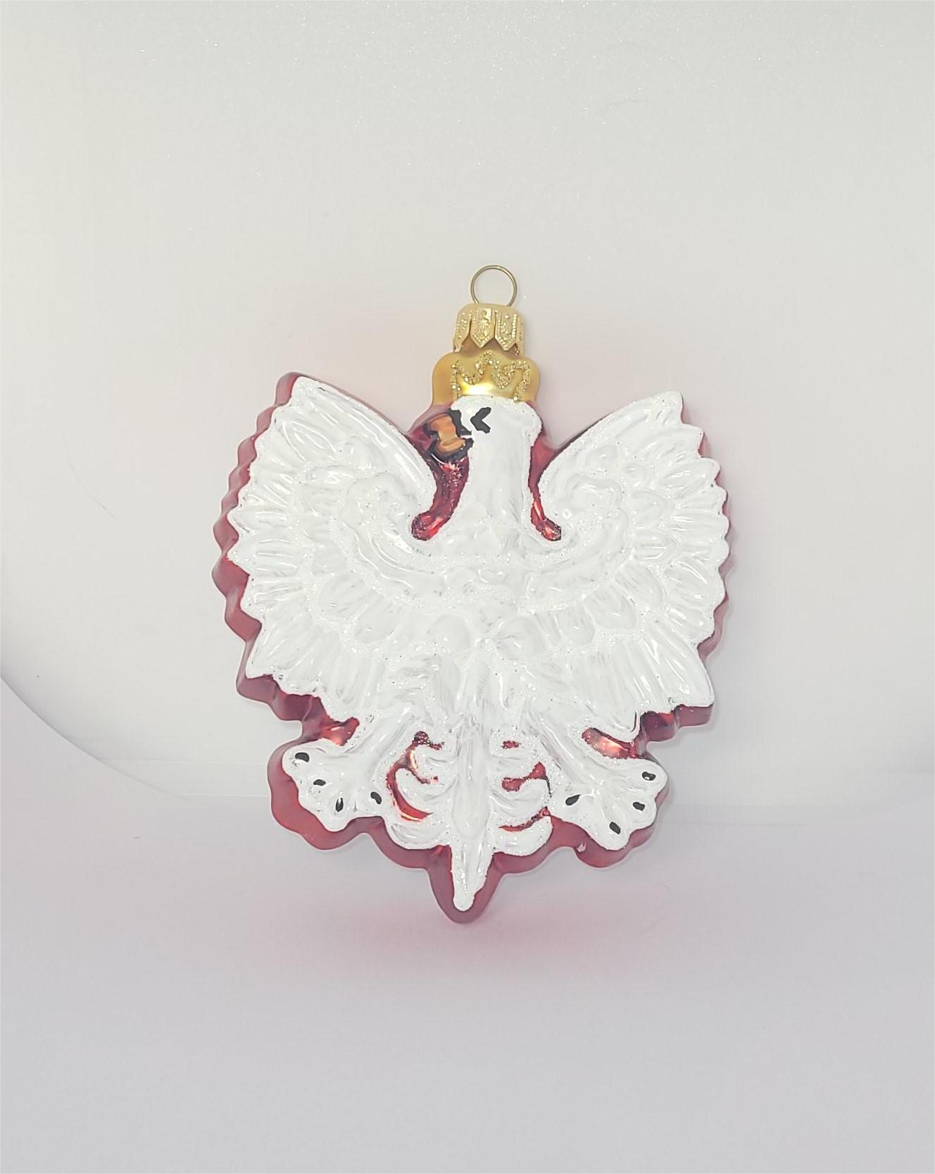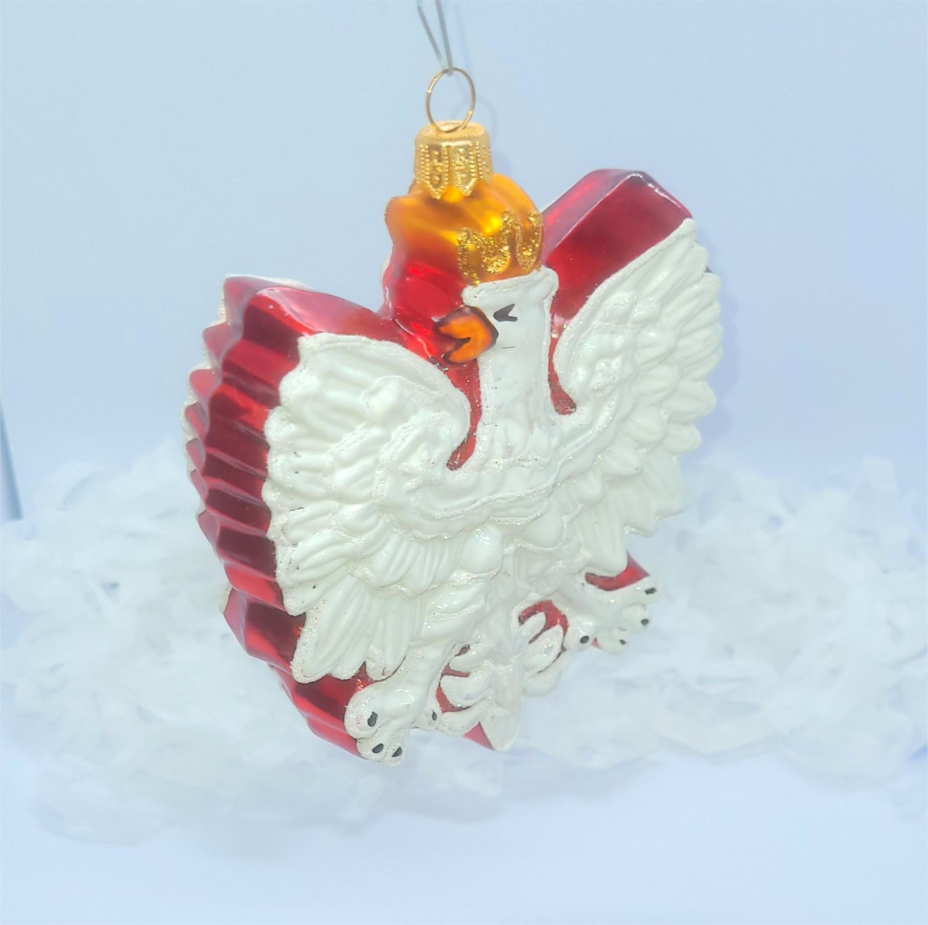 Bombka formowa w kształcie orła białego w koronie, z czerwonymi bokami skrzydeł.