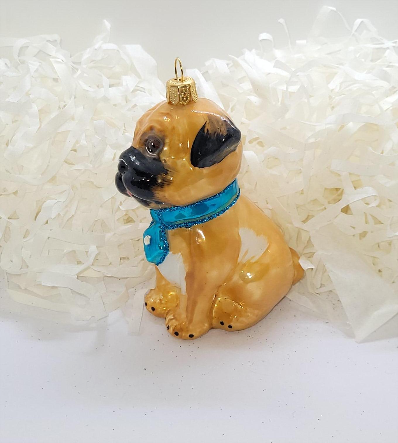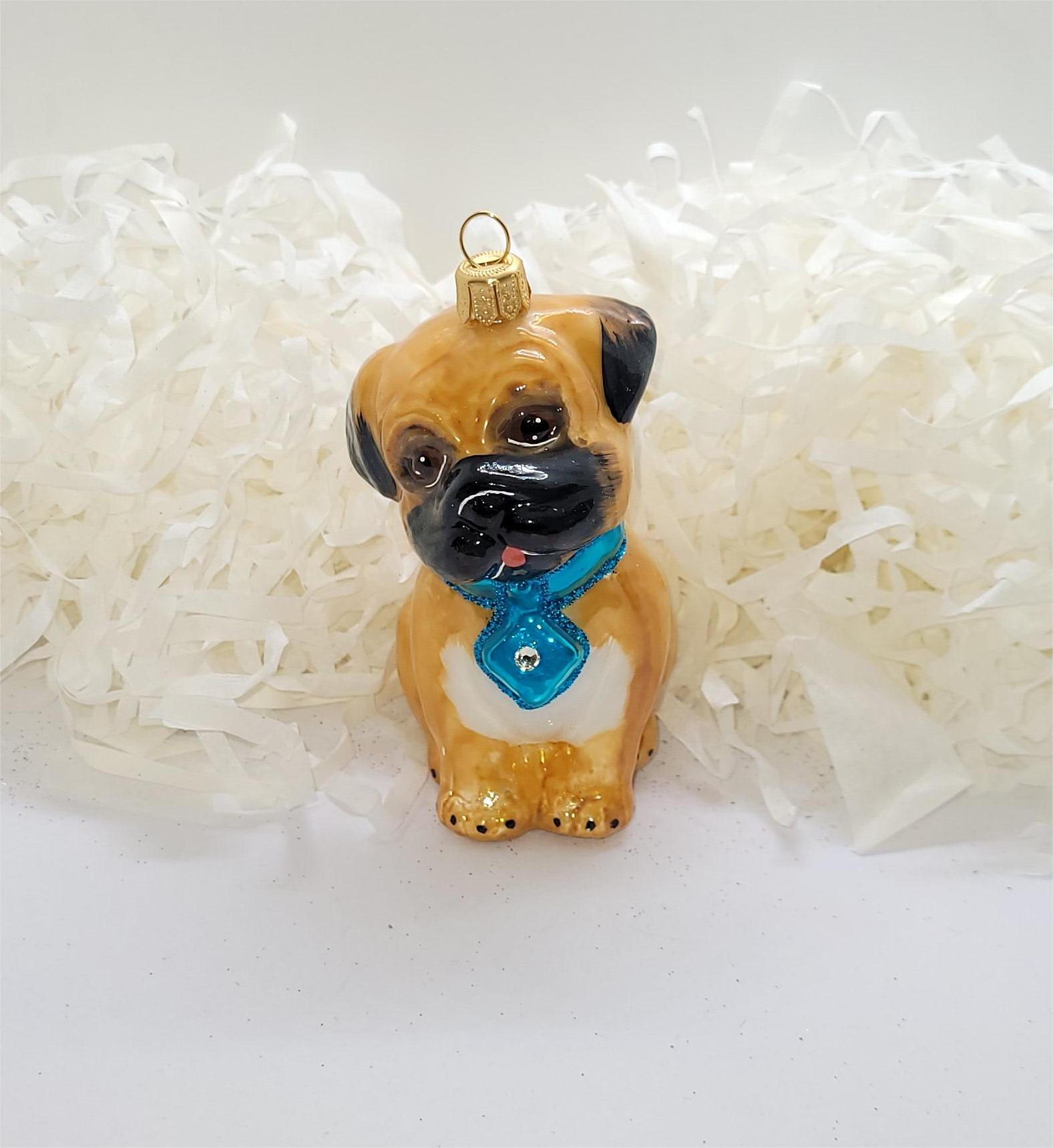 Bombka formowa w kształcie pieska z zawieszką z klejnocikiem, wzorowana na szczeniaka bulldorzka.