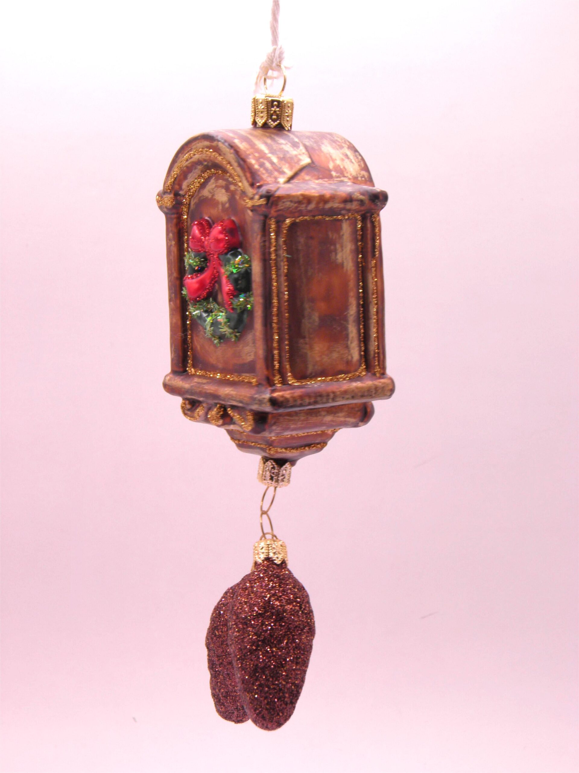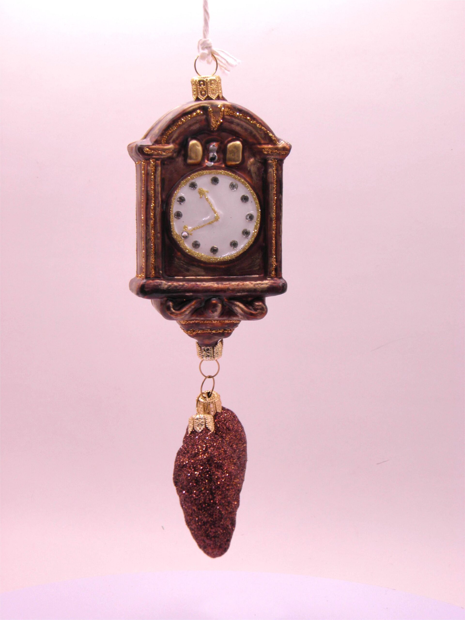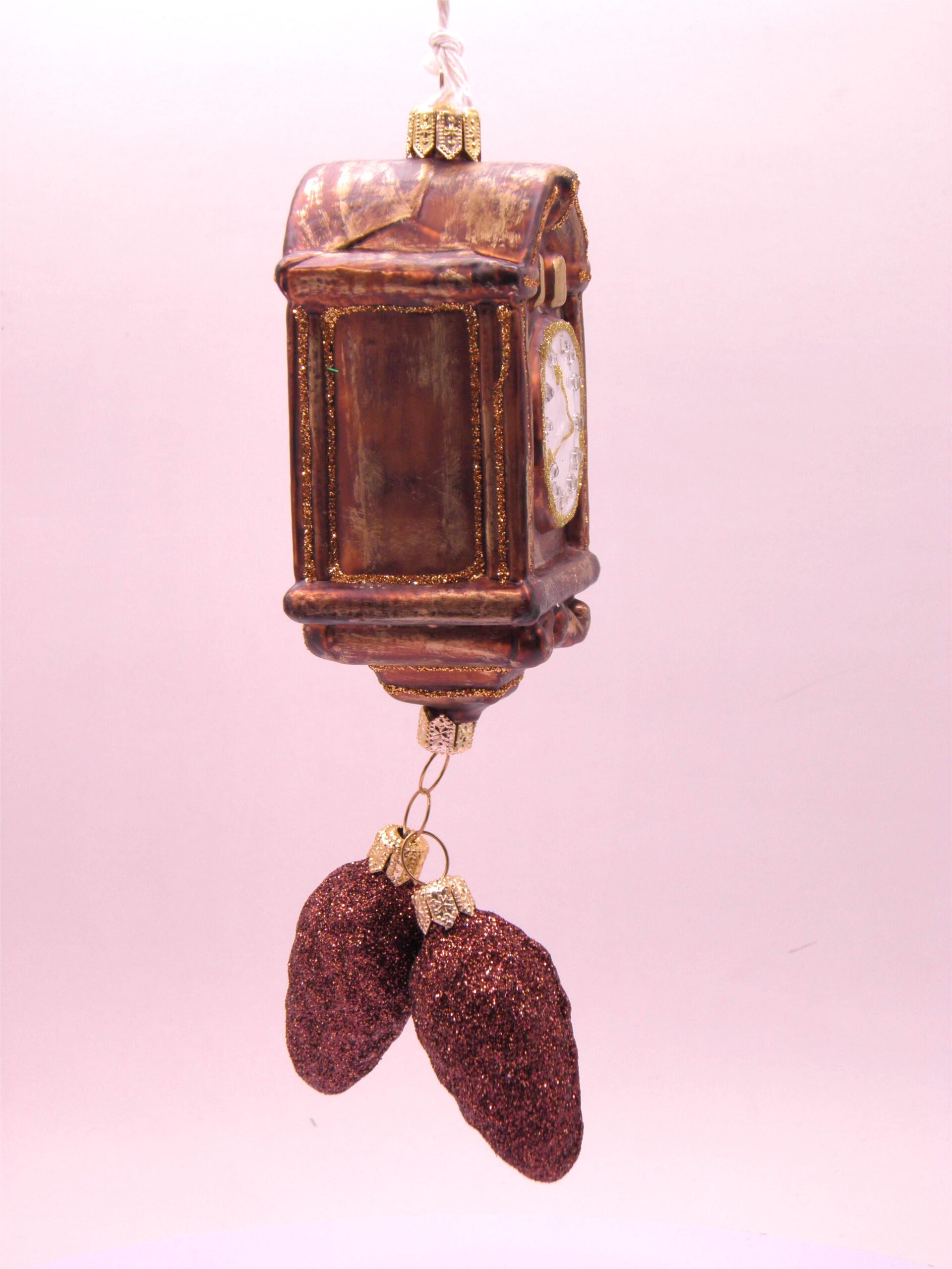 Bombka formowa w kształcie zegara z zawieszonymi pod nią szyszkami. Dostępne z szyszkami w kolorze brązowym oraz złotym.